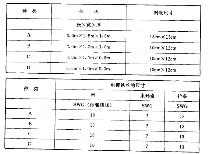 多數(shù)水力結構的防洪堤及下游漸變部分將部分地或全部地依照圖紙所示或工程師的指示用石籠墊加以防護,根據(jù)尺寸的不同下表列出4種石籠墊。