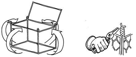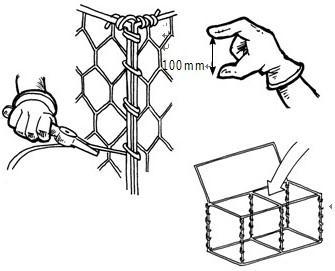 2、把每個(gè)側(cè)面立起來(lái),組合成一個(gè)網(wǎng)箱狀。網(wǎng)箱的每一個(gè)表面都有較粗的邊絲,在網(wǎng)面的邊角把這些重合的粗邊絲互相擰在一起。這些擰在一起的邊絲在邊角和綁絲重合。