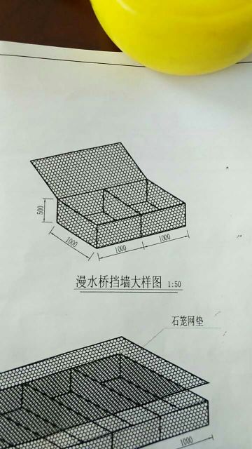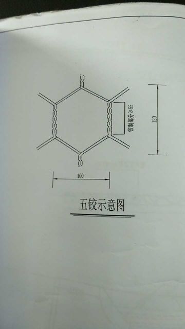 格賓網(wǎng)箱網(wǎng)片采用五絞工藝,五絞網(wǎng)目:100×120mm,絞制部分長(zhǎng)度不得小于55mm,網(wǎng)片采用高爾凡鋼絲制造,網(wǎng)絲直徑為2.5mm,邊絲直徑為3.0mm,扎絲直徑為2.2mm,網(wǎng)箱間采用鋼絲連接。連接綁扎用的組合絲、螺旋固定絲及水平拉力絲必須與網(wǎng)絲同材質(zhì),組合絲綁扎必須是雙絞線并絞緊,螺旋組合絲綁扎必須絞繞收緊,端網(wǎng)框線與網(wǎng)shen交接處必須采用螺旋組合絲絞繞收緊聯(lián)結(jié)。