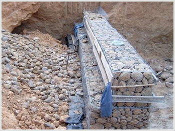選用拼裝辦法,蓋板,邊板,端板,底板獨自出產拼裝成網箱,各有些用螺旋鋼絲環(huán)繞綁縛,網箱所有邊絲均選用粗絲加強石籠網的強度。
